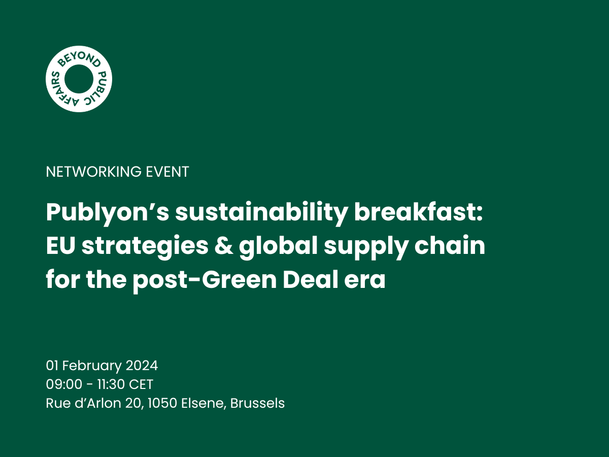Publyon is pleased to host its sustainability event on Thursday, 1 February 2024 (09:00 – 11:30) at Holland House (Rue d’Arlon 20, 1050 Brussels) to discuss the achievements and future of the European Green Deal. During the event, Ms Kate Frisby, Legal Assistant on Corporate Sustainability Reporting and Sustainable Finance in DG FISMA, will outline the main achievements of the Green Deal so far, and will look ahead to the next European mandate.